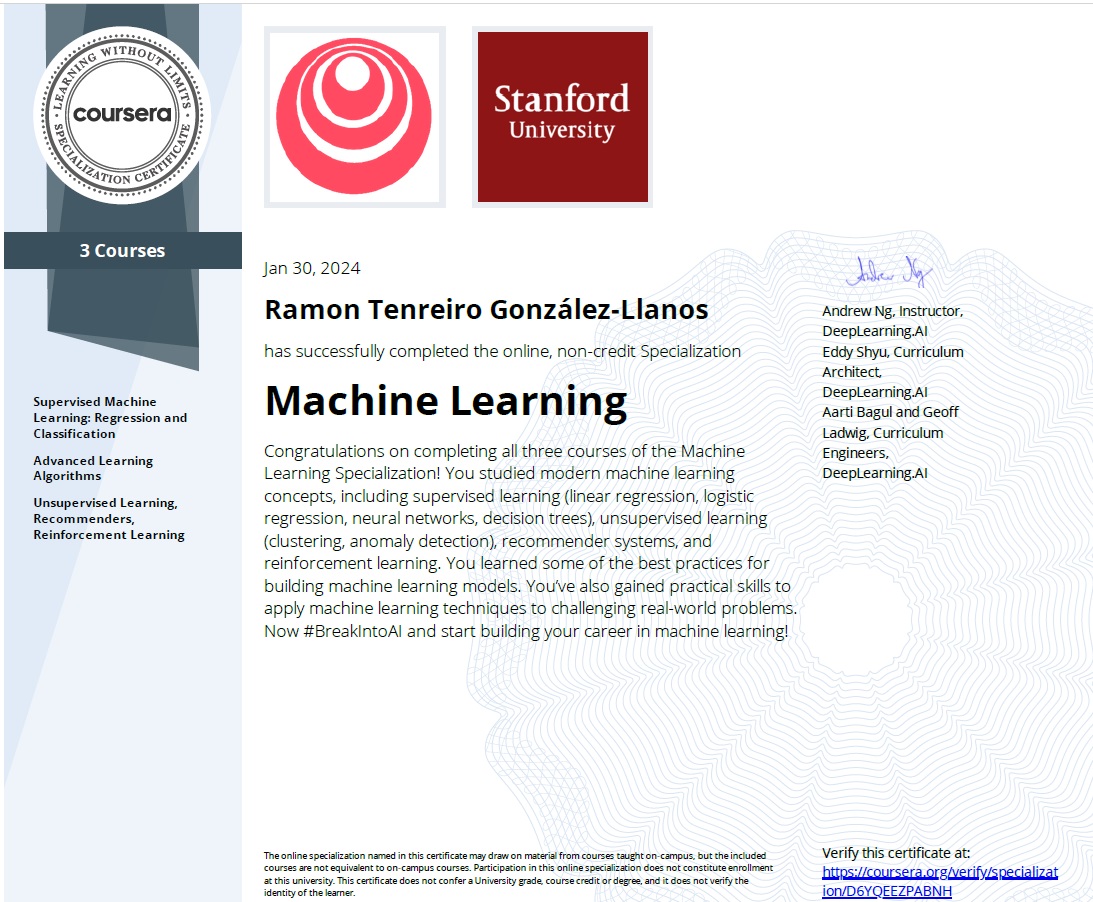 The Machine Learning Specialization created in collaboration between DeepLearning.AI and Stanford Online.It provides a broad learn to modern machine learning and some of the best practices used in Silicon Valley for artificial intelligence.GRADE: 96. Duration 12 weeks.